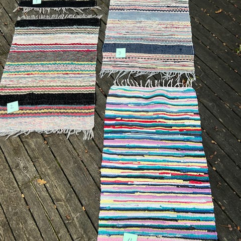 Det svenske kludetæppe på foto 16 måler, uden frynser=ren tæppe: 115 cm (bredde) x 218 cm (længde).