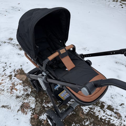 Den er mørke grå og er brugt til 1 barn i 6 måneder. Den er købt fra ny af i ønskebørn. Der er en lille skramme på håndtaget hvor der mangler stof, der er billeder af dette.