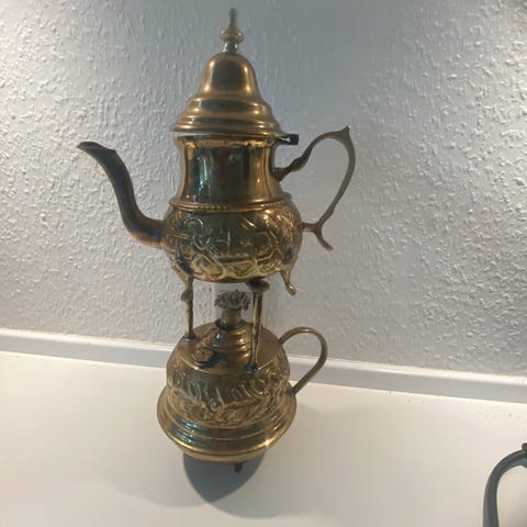 asiatisk kaffe- og tekande, messing, 120 år gl., Kaffekande og tekande,købt da min farfar var udstationeret i knap 4 år på Malacca-halvøen før første verdenskrig. Mange af tingene han bragte med hjem fra sine år derude, var kinesisk inspireret, så det er disse kander måske også. De er med fine ciseleringer i metallet. Har kun været brugt som pyntegenstande. Tekanden er ca. 12 cm høj og kaffekanden er ca. 31 ½ cm høj. Sælges helst samlet.