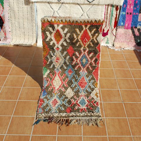 Smukt og farverigt Boucherouite tæppe, håndlavet i Marokko af genbrugte tekstiler. Hvert tæppe er unikt og fortæller sin egen historie gennem mønstre og farver.