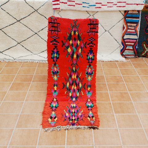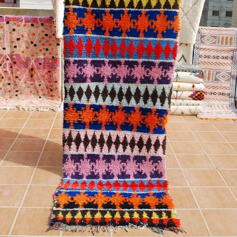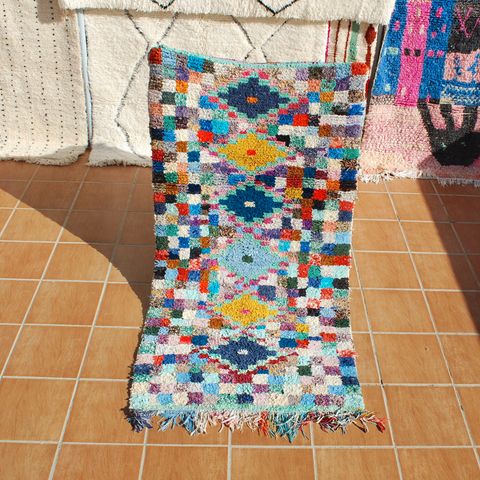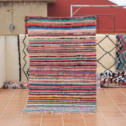 Smukt og farverigt Boucherouite tæppe, håndlavet i Marokko af genbrugte tekstiler. Hvert tæppe er unikt og fortæller sin egen historie gennem mønstre og farver.