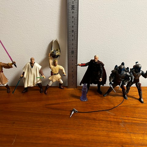 Anakin's blå lyssværd mangler og Obi-Wan's lyssværd er knækket