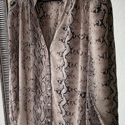 Orange skjorte fra Ravn Ravn med blomster mønster. Skjorte er v-halsen. Den er længere bagpå end foran.