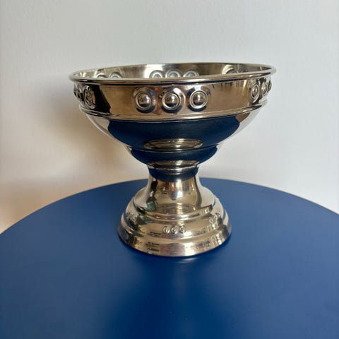 Fin lille sukkerskål med hank i sølvplet. Mærket Eneret og 2 tårne. Samt lille fad i sølvplet. Mærket ATLA. Skålen måler ca. 10 cm. i dia. og ca. 8 cm. i højden. Fadet måler ca. 21 cm. i dia. Almindelige brugsspor. Kan pudses op, så det står blankt. Sælges samlet.