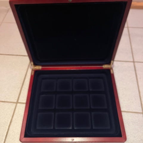 Møntæske til at opbevare og vise dine fine mønter. Der er plads til 12 stk. Den åler 24x29x5cm. Et par små ridser men ellers i pæn stand. . Mønterne på billedet følger ikke med.