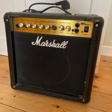 Forstærkeren er blevet brugt førhen, men står egentligt bare og samler støv, hvilket er ærgerligt, når den ikke fejler noget og spiller som den skal. Der medfølger et 7 meter inputcable.