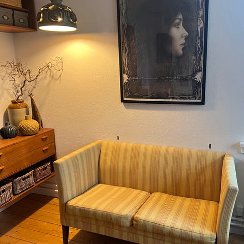 Det er i sagens natur et gammelt møbel, og betrækket har derfor slid på de sædvanlige steder (især armlæn, forkant af sæde, jf. nærbillederne)..