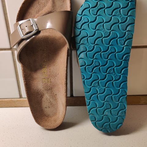 Gode sandaler fra Birkenstock, model Madrid, dame, black glace, str. 37, narrow size, indvendig sål mål 24 cm, regulerbar rem. Komfortable og ergonomisk korrekte for foden. Brugte men fine med gode såler. Nypris var 700,-