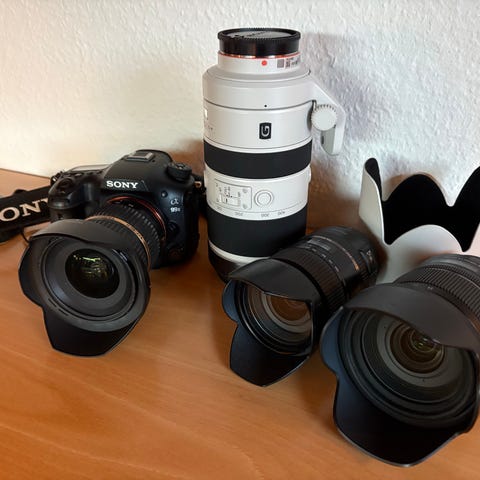 Sony A99 full frame digital kamera med to Zeiss objektiver, flash, filtre og taske, alt virker 100% ingen ridser, kun ledskærmen bag på kameraet er lidt mærkelig i overfladen med det ses ikke rigtigt når den er tændt, tror det er et normalt Sony problem. Er ikke brugt særligt meget da jeg gik lidt i stå med at tage billeder efter jeg købte det. Taske med god beskyttelse og plads til laptop eller tablet.