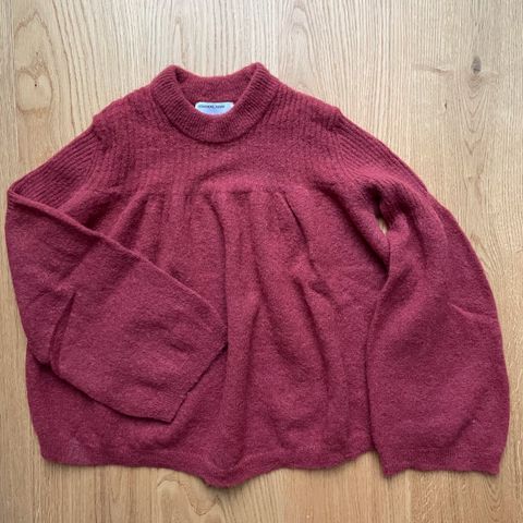 Designers Remix striktrøje i en meleret sand/lysegrå farve. Kabeldetaljer og hulmønster. Skal håndvaskes. Står hverken størrelse eller materiale i, men passer en størrelse S og tror det er uld. I meget god stand (har bare noget fnuller, der kan fjernes).
