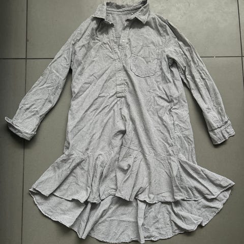 Designers Remix Remade lang lyseblå/hvid skjorte i det fineste vævede stof. Vil sige at den passer S/M eller en oversize xs. Med krave og rynkebånd, der bindes på midten. Bomuldsblanding. Det ene ærme er let hæftet sammen forneden, det andet er gået op/åbent. Man kan enten åbne det ene ærme eller hæfte det andet alt efter, om man ønsker dem lukkede eller åbne. Brugt en gang, som ny.