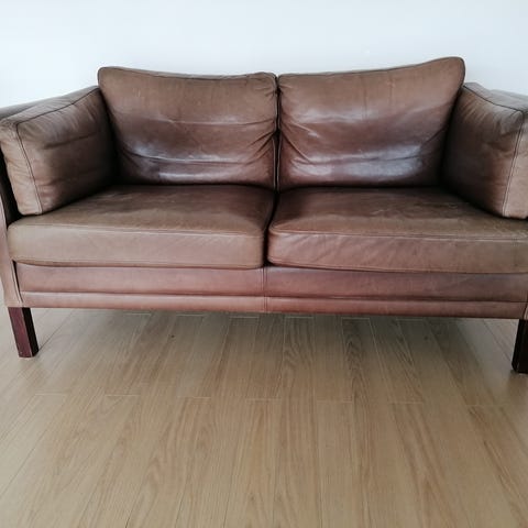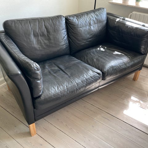 Meget velholdt 3 personeres sort lædersofa med patina. Læderet har en smuk naturlig og rustik overflade (er af anilintype). Hynderne er helt faste og man sidder godt i sofaen. Ben 4x4x17cm er bejdset/ bøg. Priside angivet.