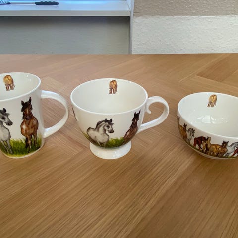 Porcelæn, Skål, Hest, Flot stor bord skål som også kan hængs op på væggen som platte 30 cm bred og 5 cm høj virkelig flot med de to Heste og Guld kanten