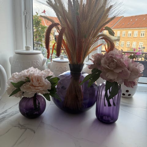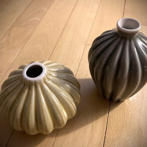 Jeg er lidt usikker på materiale, de er cirka 22 cm og 30 cm høje cirka, meget lille åbning og jeg tror ikke de er beregnet til blomster, men mest til dekoration, en tør kvist eller enlig tøf blomst eller 2 kunne jo være sagen. Smuk limegrøn farve med tynde striber. Det er lidt slidtager på den store vase men kig på foto. De skal afhentes ude i min kolonihave på oliefabriksvej/kastrup tæt på fields.