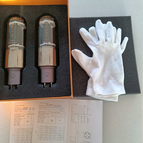 Super velspillende rør, pakket i lækker kasse, testrapport for hver enkelt rør, Matched Pair, Keramisk sokkel, guldben, 3 mdr. garanti, prisen er for et par