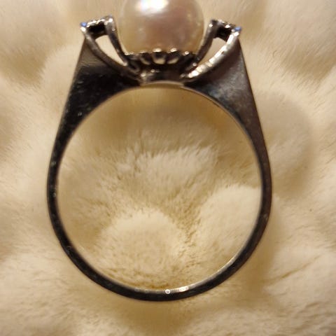 Smuk ring hvidguld med perle. Hvidguldet smukt lavet som stjerne omkring perlen, banket så det ligesom glimter. Mrk 585 ca 17 mm svarer til størrelse 50 vejer 2,69 gram. Kr 2100