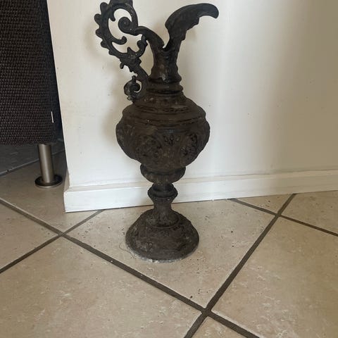 Prydkander af bronze med fod af marmor, Par prydkander af bronze prydet med putti i landskab, base af rødbroget marmor. Fra 1900 tallet. H. 25 cm.