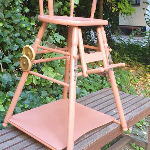 Flot vintage rød højstol, som kan laves om til stol med legebord. Kan ikke køre på hjul.