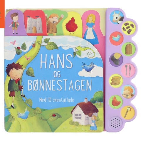 Billedbog. Eventyret om den fattige Hans der sælger morens eneste ko for 5 bønner. De magiske bønner bliver til en stige der vokser op over skyerne. Den fører Hans til kæmpens slot og alle hans skatte.