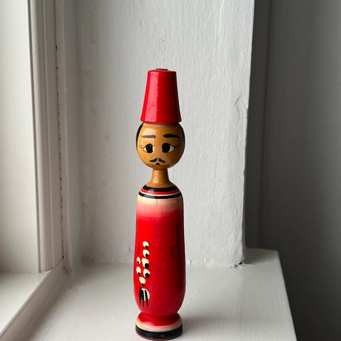Så fin lille håndlavet dukke i træ og stof - fin til påskepynt fx.