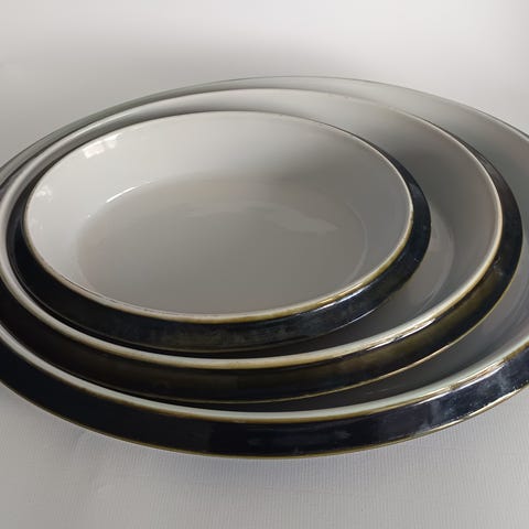 Porcelæn, Ildfast skål med låg, Aluminia Pyrolin, Meget flot sort pyrolin skål med guldkant og med et låg, som også er ildfast og som kan bruges som et fad. Højde 11 og diameter 24.
