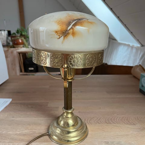 Lampe, Bordlampe i messing og glas højde 35cm kuppeldiameter forneden 22cm absolut fast pris kan ikke forhandles kr200. Fkt