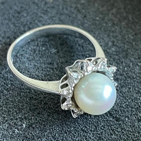 Ring hvidguld med perler og sten. Meget smuk ring med fine detaljer. Mrk. 585 måler ca 16,8 så str 53 vejer 3 gram