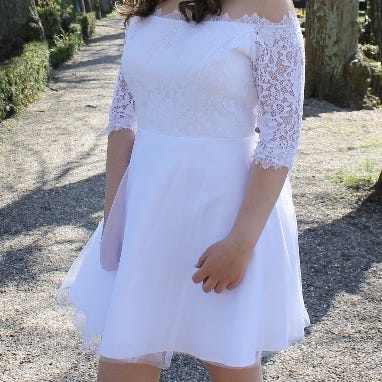 Fin og let konfirmations kjole med flæser på nederdel. Falder så let og elegant. Kom og prøv.