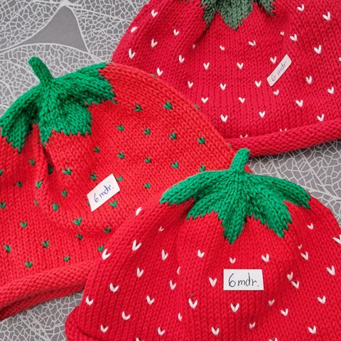 Håndstrikket bomulds jordbærhue i str. voksen. Det r kun denne ene der er til den pris.