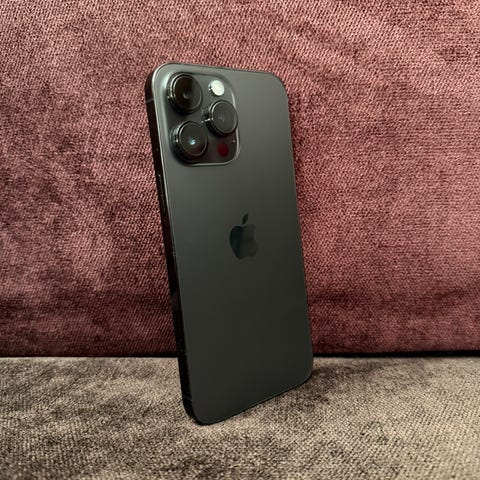 Apple iPhone 14 Pro Max smartphone med 128 GB lagerplads. Enheden har en stor skærm, flere kameraer på bagsiden og en robust konstruktion. Farven på telefonen er mørk, og den er designet til at levere høj ydeevne og brugervenlighed.