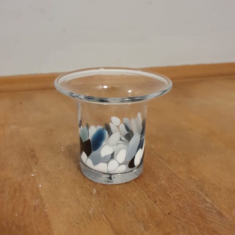 Glas, Fyrfad/lysestage, Reims France, Kombineret fyrfadsstage og lysestage fra glasværket i Reims. Højde 5,5 cm, diameter 7 cm. kr 25,-/stk. har ialt 12 stk.