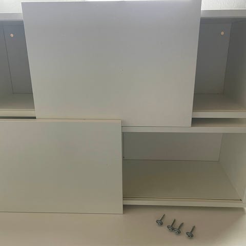 Fin vægreol med 2 skydelåger i plast. Undgået model hos IKEA. Der er ingen bagbeklæding, så det vil være væggen, som danner denne. Mål: H: 30 cm x D: 26 cm x L: 207 cm. Farve: hvid