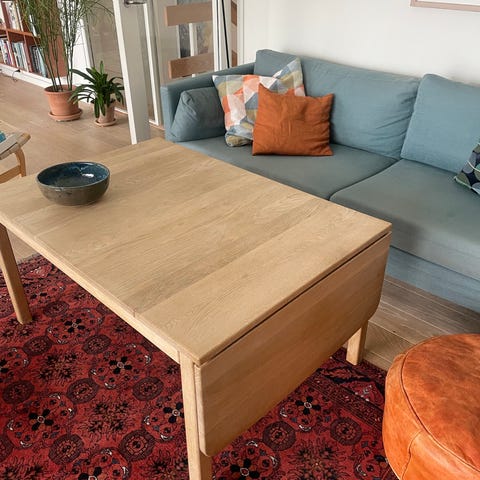Klassisk sofabord med klap fra Haslev møbelsnedkeri i sæbebehandlet bøg.
