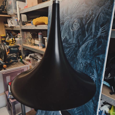 Trompet lampen : Riboli fra Lyskær Ø 45 cm hvid klar kant m/tynde hvide striber