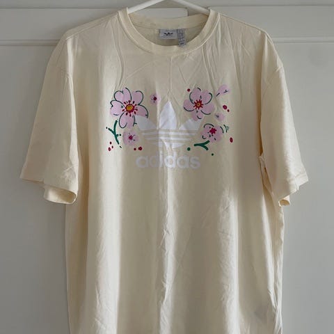 Pink t-shirt fra Adidas x Karlie Kloss, med en QR-kode, der leder til Adidas hjemmeside, foran i venstre side og monokromatiske tre striber centreret i nakken. Har en plet foran, som ikke er særlig synlig, men den er der, så se venligst alle billeder før køb. Størrelsen er EU 42-44, hvilket for Adidas er Large - se venligst sidste billede for officielle Adidas størrelse detaljer.