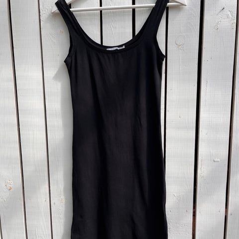 En sort basiskjole fra Samsøe Samsøe, i modellen ‘Sue long solid’, perfekt til at bære under noget andet eller bare som den er. Er måske brugt én gang og størrelsen er M/L, men angivet som M, da dobbeltstørrelser ikke er en mulighed at angive.