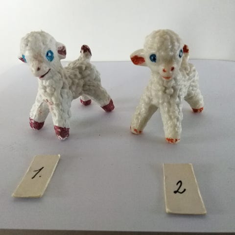 Funny lam med store sko. 16 cm stor. Ved ikke hvad den er lavet af, keramik, gips e.a. Fungerer som pynt men er egentlig en sparebøsse med gummiprop i bunden.