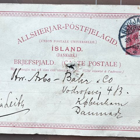 Island. 1906. Brevkort sendt til Danmark.