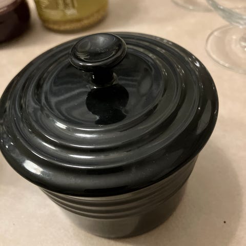 1 stk. ramekin med tætsluttende låg. Ø: 10cm. H: 7cm. 95kr.
