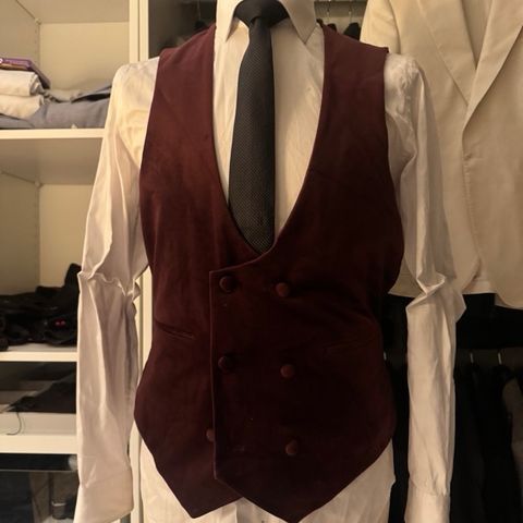 Dobbeltradet vest med buks fra twisted tailor. Nålestribet og kun brugt få gange. Utrolig flot sæt med en rigtig flot bagstykke på vesten. Det er en semi smal pasform og passer til en der er 165-170 i højden. Sælges da det er blevet for småt til mig