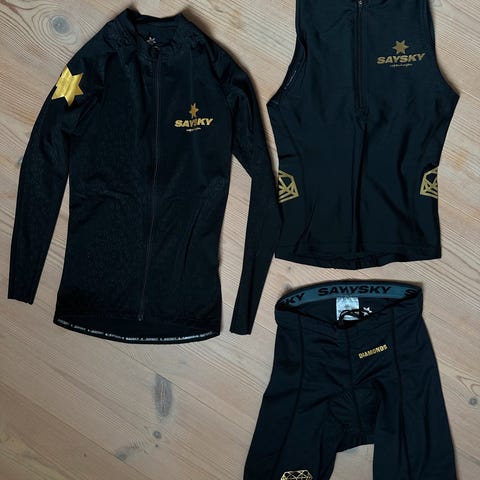 Har også også tri-dragter, løbetøj, jakker, cykle-/løbebluser, løbedragter/-sæt (tights / shorts og bluse), cykledragt / -sæt (blå), løse ærmer og en våddragt