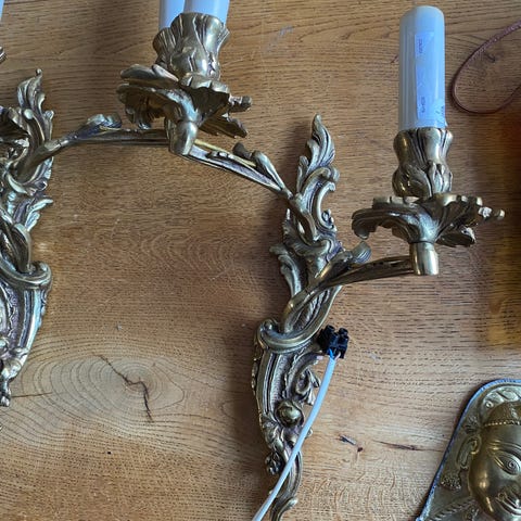 To meget gamle messing lampetter. Mål ses på billeder. Sælges samlet for 280,-Lampedkærmene kan medfølge.