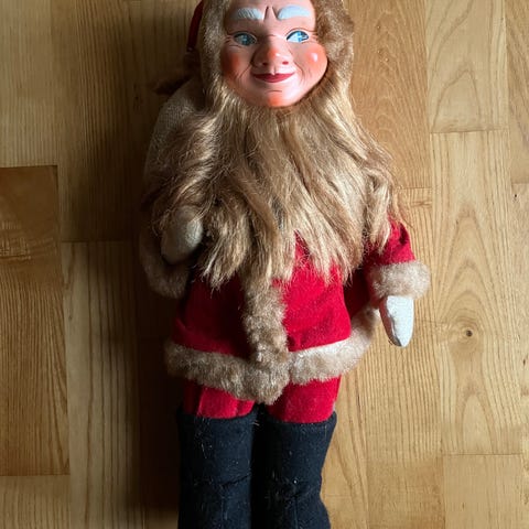 Julemand med merskumspibe, Fin julemand,- der er pyntet med merskumspibe, ur og briller. En dekorativ julemand der vil stå fint til udstilling eller i det julede hjem. Han er 90 cm høj.