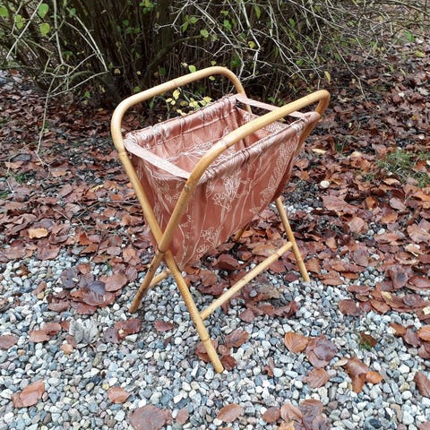 Holder til strikketøjet eller til dine ugeblade og magasiner. Lavet i gammel bambus. Stofposen er af kraftigt hessian-lignende stof med fine broderier. Foret med bomuldsstof. Der er indvendige lommer. Stoffet er revnet lidt i den ene side - se foto.