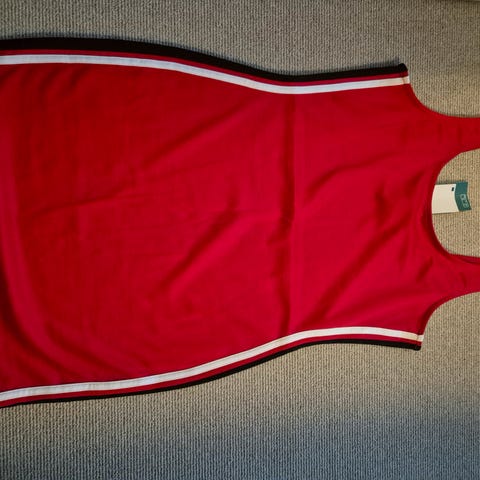 Er længere bagpå end foran,har puf ærmer.Lyseblå med striber.