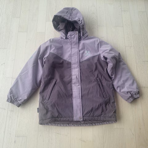 Lækker Hummel lilla vinterjakke med glimmer vinkler på skuldre. Str. 152. Brugt begrænset og kun til pæn brug. Generelt rigtig fin stand MEN den har fået en rift på ryggen nederst på ca 4 cm. Jakken kan sagtens stadig bruges og riften har ikke afgørende betydning for brugen af jakke og Hvis man vælger at sætte en lap henover får man her en flot dyr vinterjakke i høj kvalitet til billige penge.