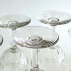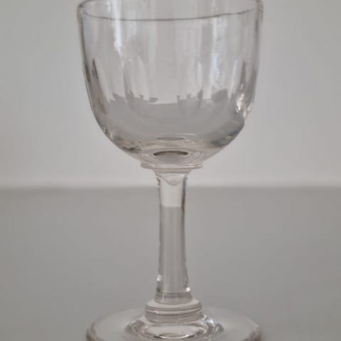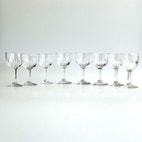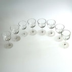 Sæt bestående af otte Murat hedvinsglas, fremstillet i klart presset glas omkring 1940–45. Glassene måler mellem 9,7 og 10 cm i højden og repræsenterer en klassisk dansk formtype, ofte omtalt som “fattigmandsderby” – et folkeligt kælenavn for prisvenlige glas med dekorativt udtryk, inspireret af mere eksklusive slebne modeller.