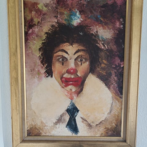 Maleri med klovn signeret noget ala "filiger" eller "filig.." De sidste to bogstaver kan jeg ikke tyde.