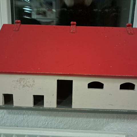 Stald til dyr. Taget kan løftes af. Brugsspor og patina, men mange lege timer endnu. Længde38,5 cm. Bredde 12 cm. Højde uden tag 6 cm højde med tag 10,5 cm. Vejer 838 gram.