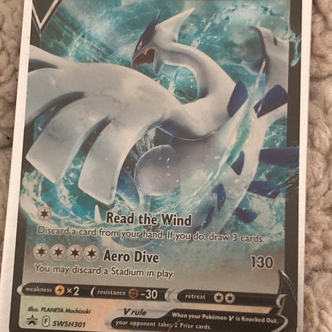De kort jeg sælger er en Jirachi v kort som der også kradser når man rører ved det, en Rockruff, en Lumiflora ex som også kradser når man rører ved det og til sidst har vi en Snorlax med en fugl på maven.